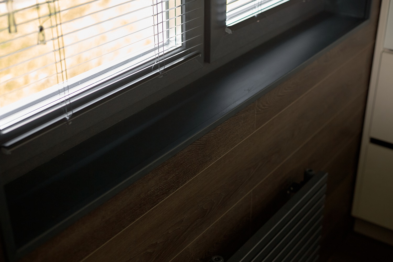 От застройщика был ровный наливной, проблем при укладке не было: сначала положил подложку, потом укладывал кварцевый ламинат. Замки с двух смежных сторон защелкиваются достаточно легко но надёжно, прямые подрезки делал монтажным ножом, фигурные около окна – лобзиком и болгаркой.