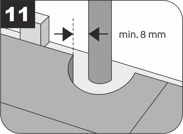 2) крепление любых конструкций (унитазы, бидэ, встроенная мебель, дверные ограничители и т.п.) без соблюдения зазоров вокруг оси крепежного элемента (см. п. 9).